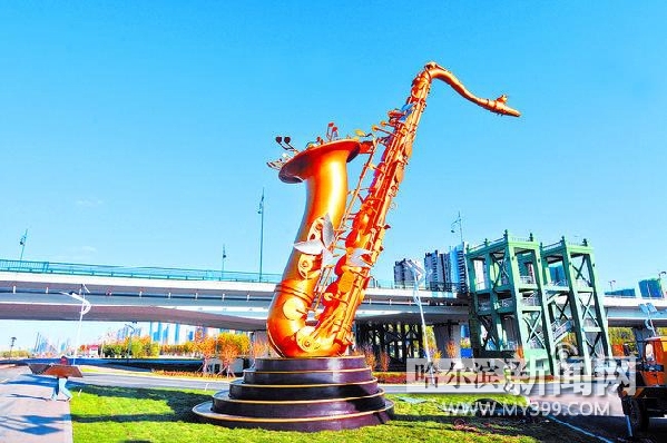 城区又多一处景观。记者从道里区获悉,昨天,一座13.8米高的金色“萨克斯”主题雕塑,在阳明滩大桥下西侧、堤顶路旁落成。